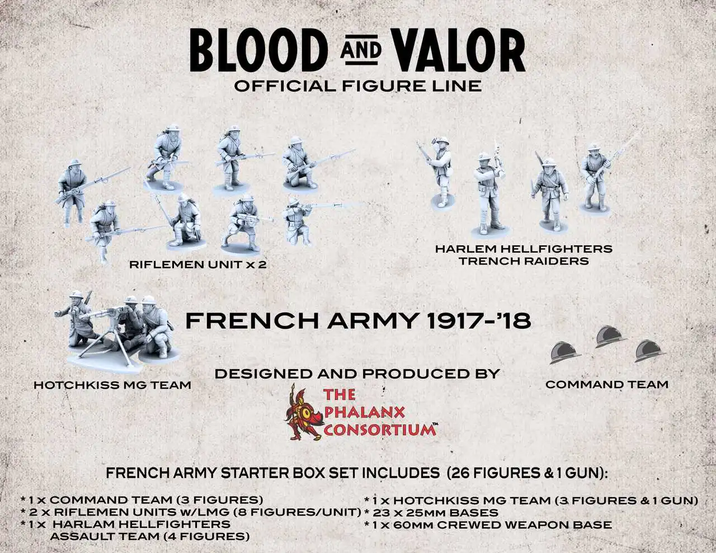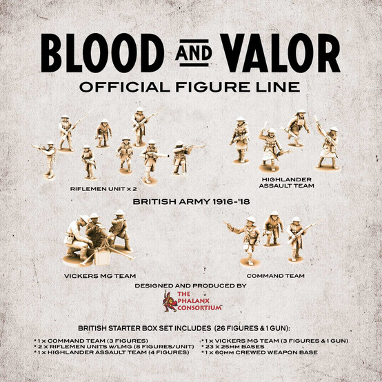 Para Blood And Valor, ya estamos incorporando el rango de miniaturas de Phalanx Consortium, por lo que ya pueden pedir con nosotros su catálogo de figuras para poder disfrutar de este genial juego sobre la primera guerra mundial. A continuación pueden ver varias de las fotos de los sets de inicio y las piezas de artillería que podrán disfrutar en sus mesas de juego: